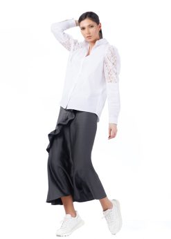Fusta dama RVL, lunga, usor evazata, cu un volan aplicat pe partea stanga.