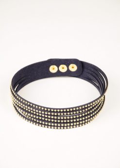 Accesorii pentru incaltaminte din piele ecologica de culoare bleumarin, decorate cu bile aurii. Se pot folosi ca bratara dubla. Se inchid cu capse. Lungime; 40 cm. Latime: 2,5 cm