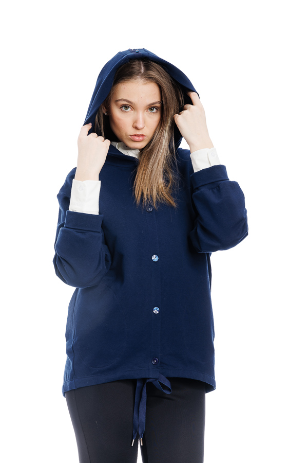 Cardigan dama RVL, albastru, casual, cu gluga, siret la terminatie si detalii decorative pe spate.