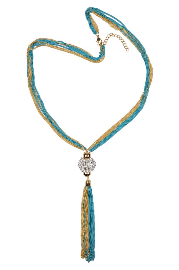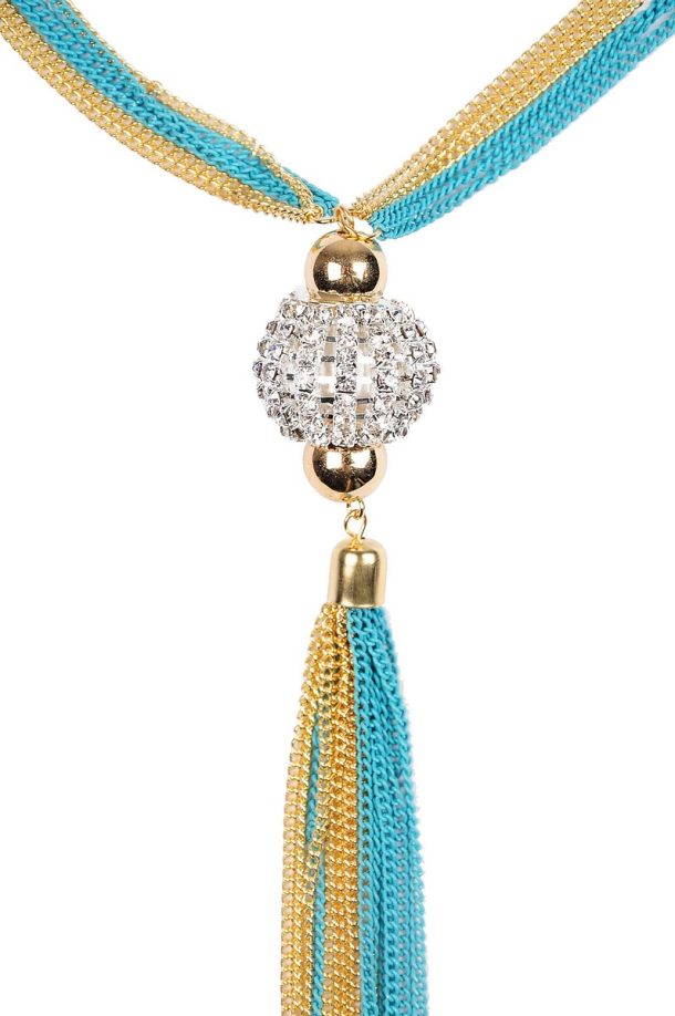 Colier realizat din lanturi aurii si bleu. Are un pandantiv din doua elemente: o sfera metalica cu cristale albe, de care este prins un canaf din lanturi aurii si bleu. Dimensiuni: 69 cm + 7 cm lantisor de prelungire; lungime pandantiv – 17 cm