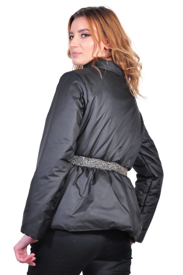 Geaca neagra scurta de dama, realizata din fas de calitate. Produsul are o banda cu strasuri in talie. Se inchide cu fermoar metalic. Aceasta geaca neagra scurta de dama face parte din Colectia Toamna – Iarna 2017/2018.