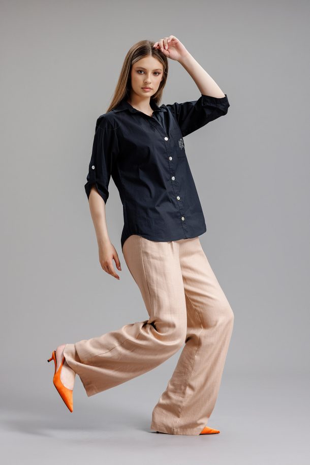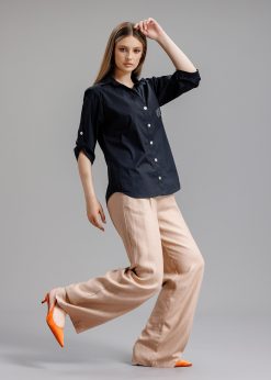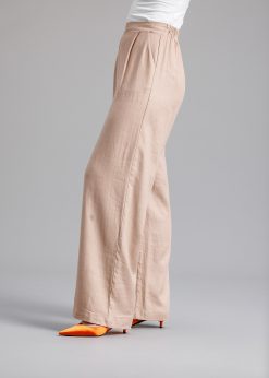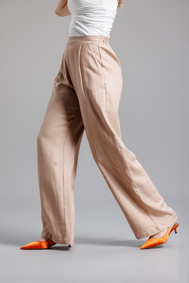 Pantalon din in RVL, bej, casual, lung, lejer, cu elastic in talie, perfect pentru zilele calduroase de vara.