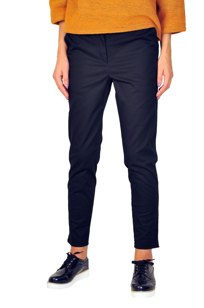 Pantalon dama de culoare neagra, cu vipusca alba in talie. Prezinta 2 buzunare laterale si 2 la spate. Acest model de pantaloni iti poate oferi relaxarea de care ai nevoie la birou sau la iesirile in oras. Face parte din Colectia Toamna – Iarna 2015/ 2016.