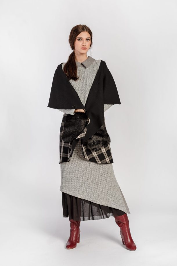 Pelerina gri carouri cu buzunare de blana, designer Violeta Gaburici.