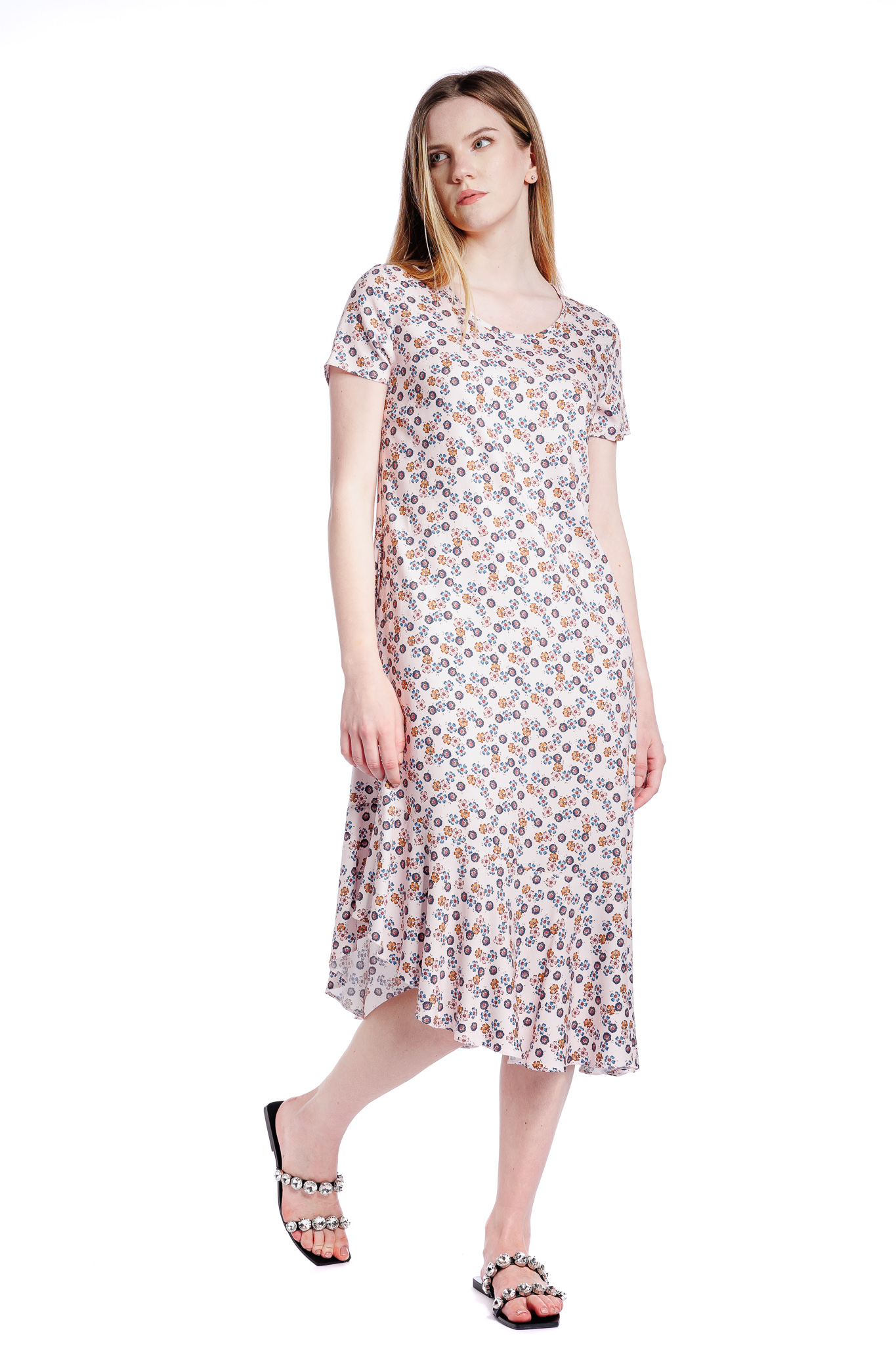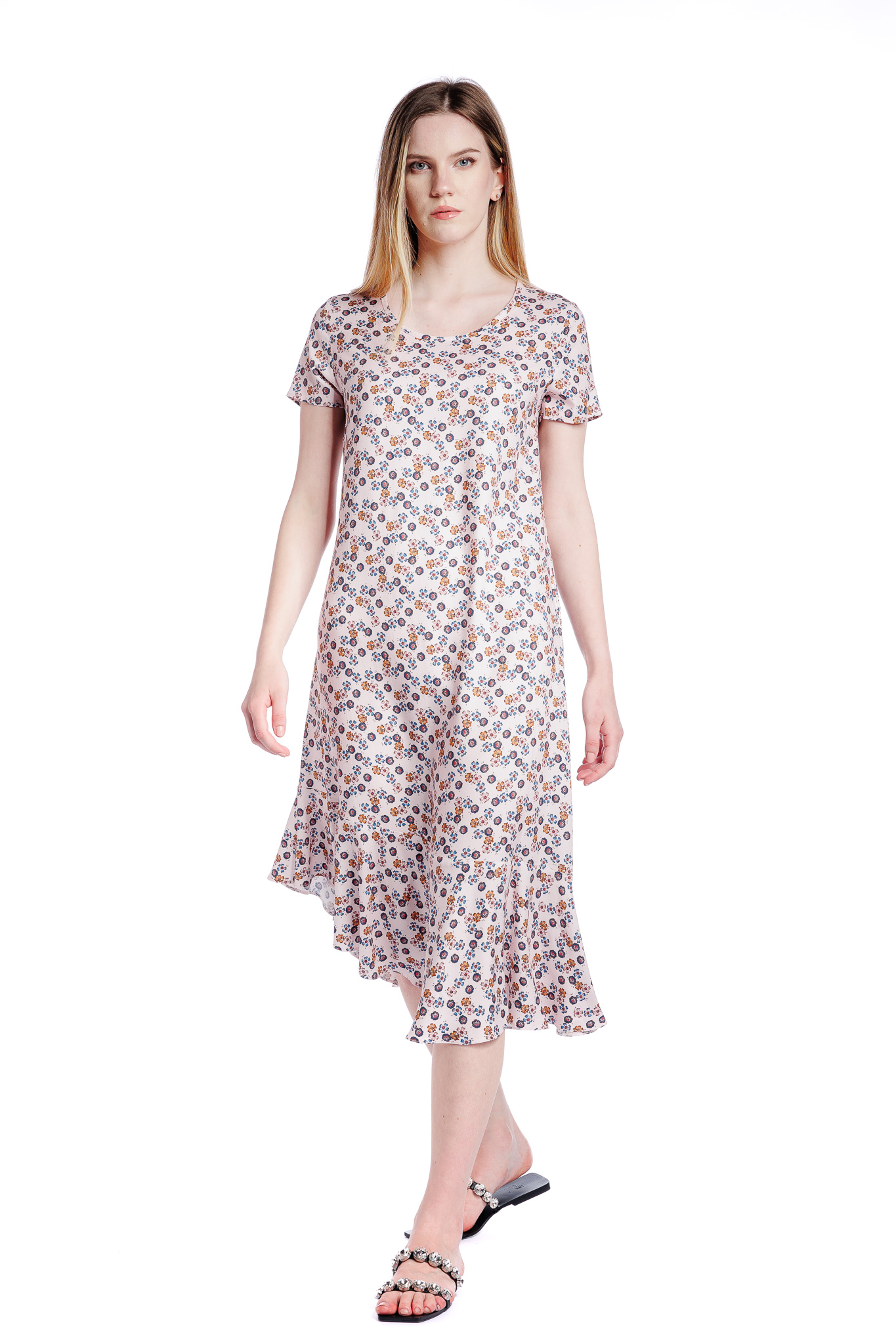 Rochie dama RVL, din viscoza satinata, asimetrica, midi, casual, cu un croi lejer, maneca scurta si volan la terminatie.Rochia este perfectă pentru zilele călduroase de vară .