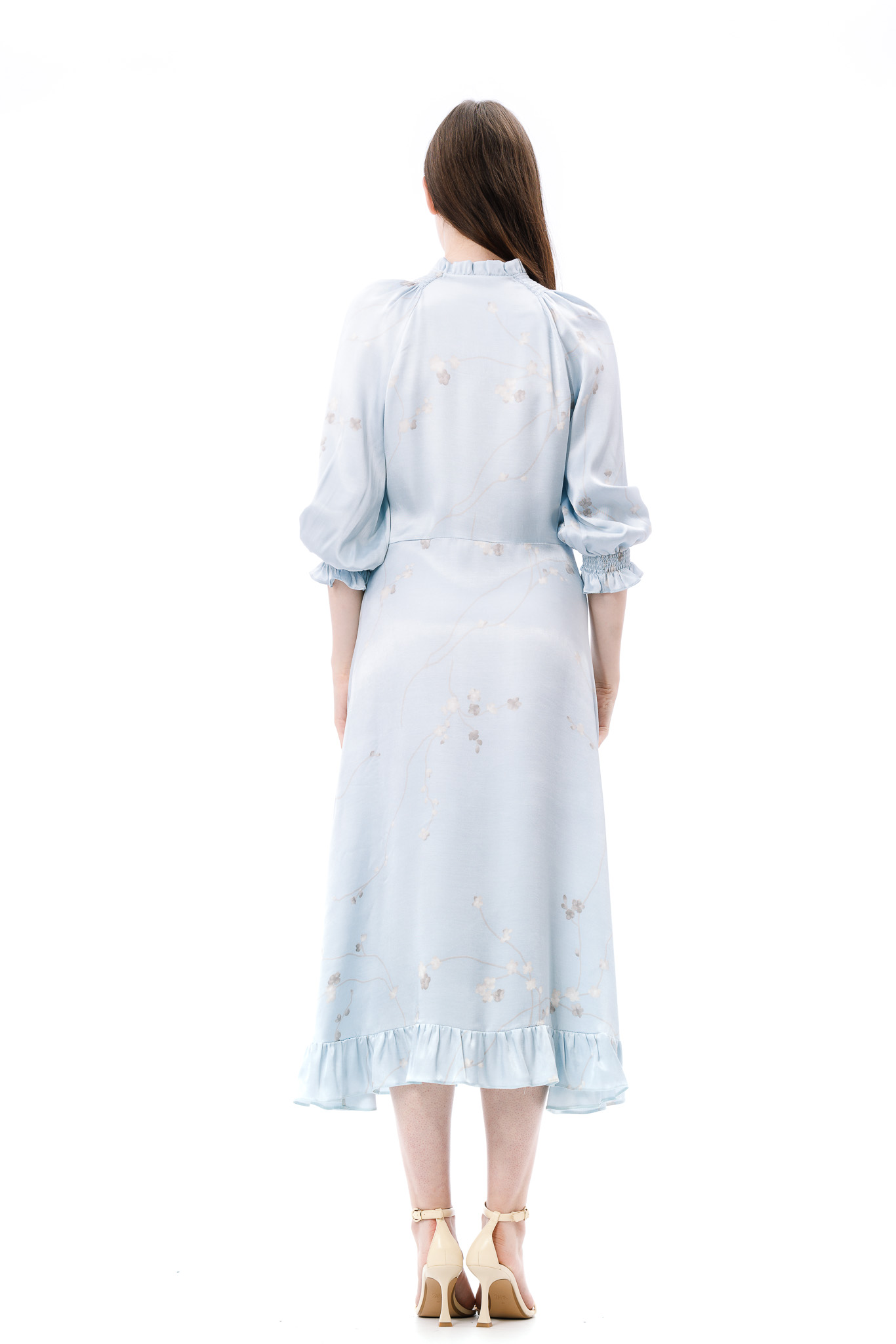 Rochie dama RVL, bleu, usor cambrata, cu maneca 3/4, cu cusaturi ornamentale din fire elastice, atat pe maneca cat si pe umar. Rochia se inchide frontal, cu nasturi tip scoica, cusuti manual.