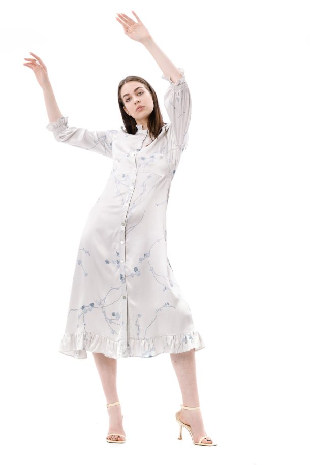 Rochie dama RVL, gri, usor cambrata, cu maneca 3/4, cu cusaturi ornamentale din fire elastice, atat pe maneca cat si pe umar. Rochia se inchide frontal, cu nasturi tip scoica, cusuti manual.