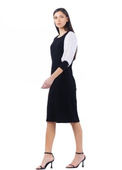 Rochie midi din tricot RVL, alb/negru, cu doua texturi, un croi lejer, maneci din voal plisat.
